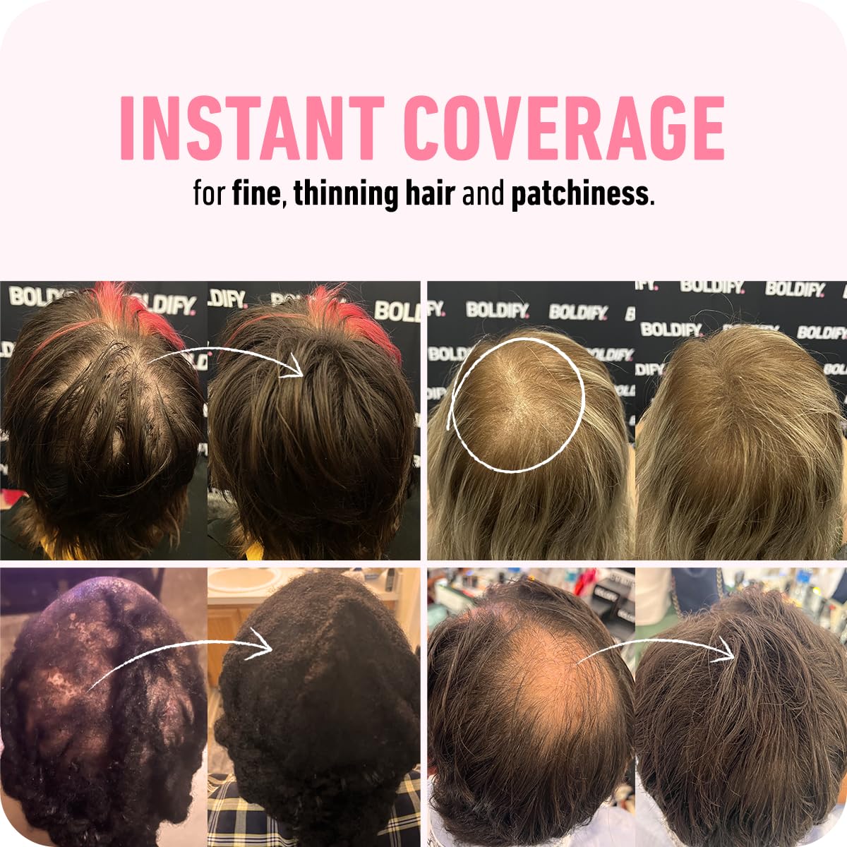 We're a collective of hair stylists, professionals, students, parents, and everything in between focused on creating accessible and innovative products that flip the narrative and empower instead of shame those struggling with their hair.That means clean ingredients, bold packaging, and stylist-approved effective formulas that deliver results.BOLDIFY Hair Thickening Fibers instantly cover bald spots, thinning, and patchiness across your temples, part, crown, and sides.