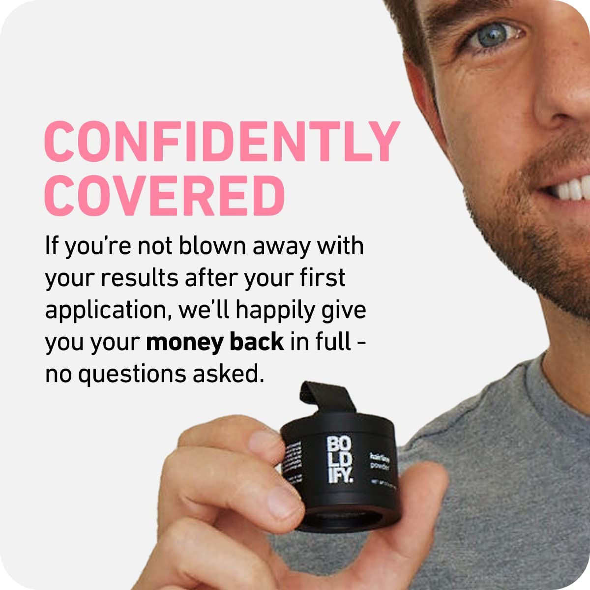 Boldify Hairline Powder Fast Application Instant Coverage 48 Hour Staying Power All Natural Look that Wont Wear Off Leaves Pores Feeling Clear & Clean Won’t Stain, Damage, or Leak on Your Hands or Clothing Boldify Hairline Powder Easy to use powder comes tucked neatly into a compact case, complete with application puff, making it the ideal patch fixer when it's time to leave the office and throw your hair up into a ponytail at the gym. Goes on fast, stays on strong, and only comes off with shampoo in your post-workout shower.