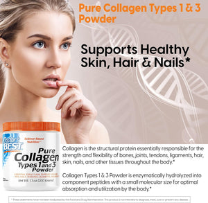 Doctor's Best Pure Collagen Types 1 and 3 contains pure collagen protein, which contribute to the growth and maintenance of healthy tissues. Collagen is the structural protein essential for the strength of bones and flexibility of joints, tendons, ligaments, hair, skin, nails, and other tissues throughout the body. Collagen Types 1 and 3 Powder is enzymatically hydrolyzed into component peptides with a small molecular size for optimal absorption and utilization by the body.