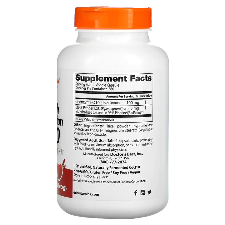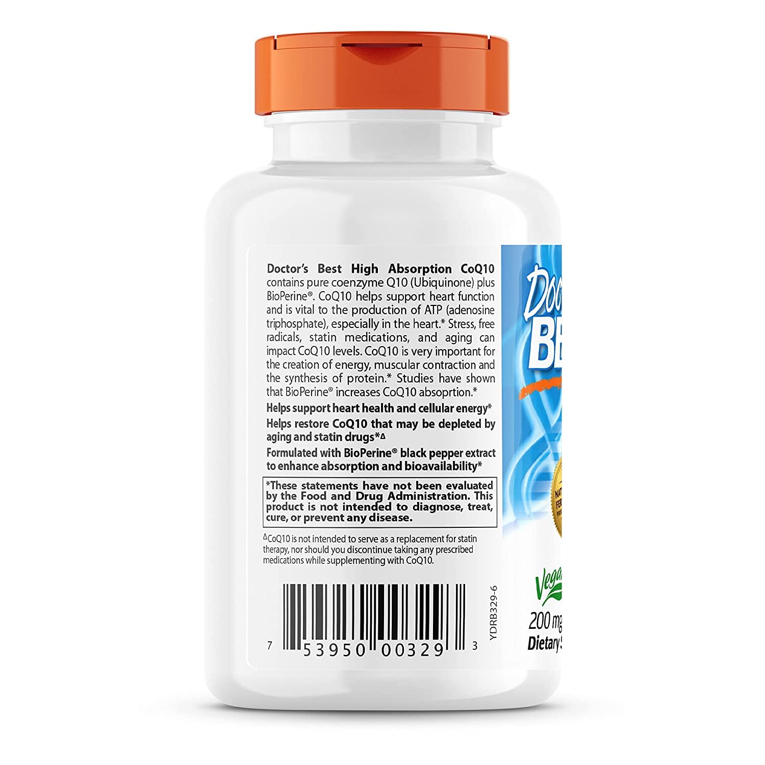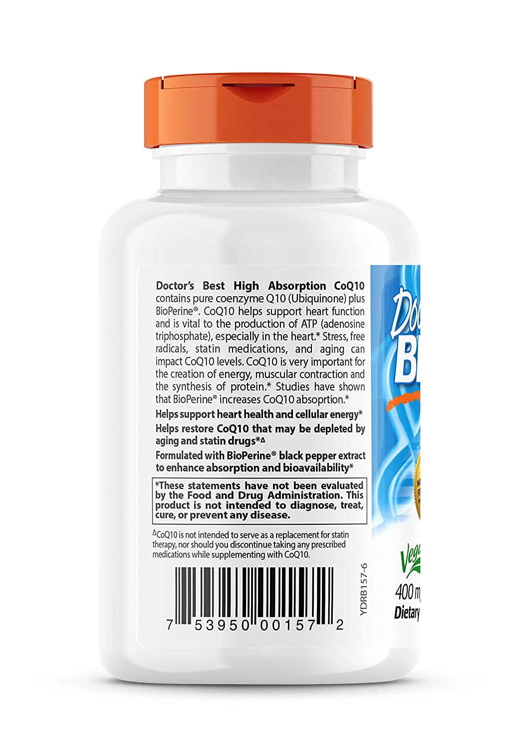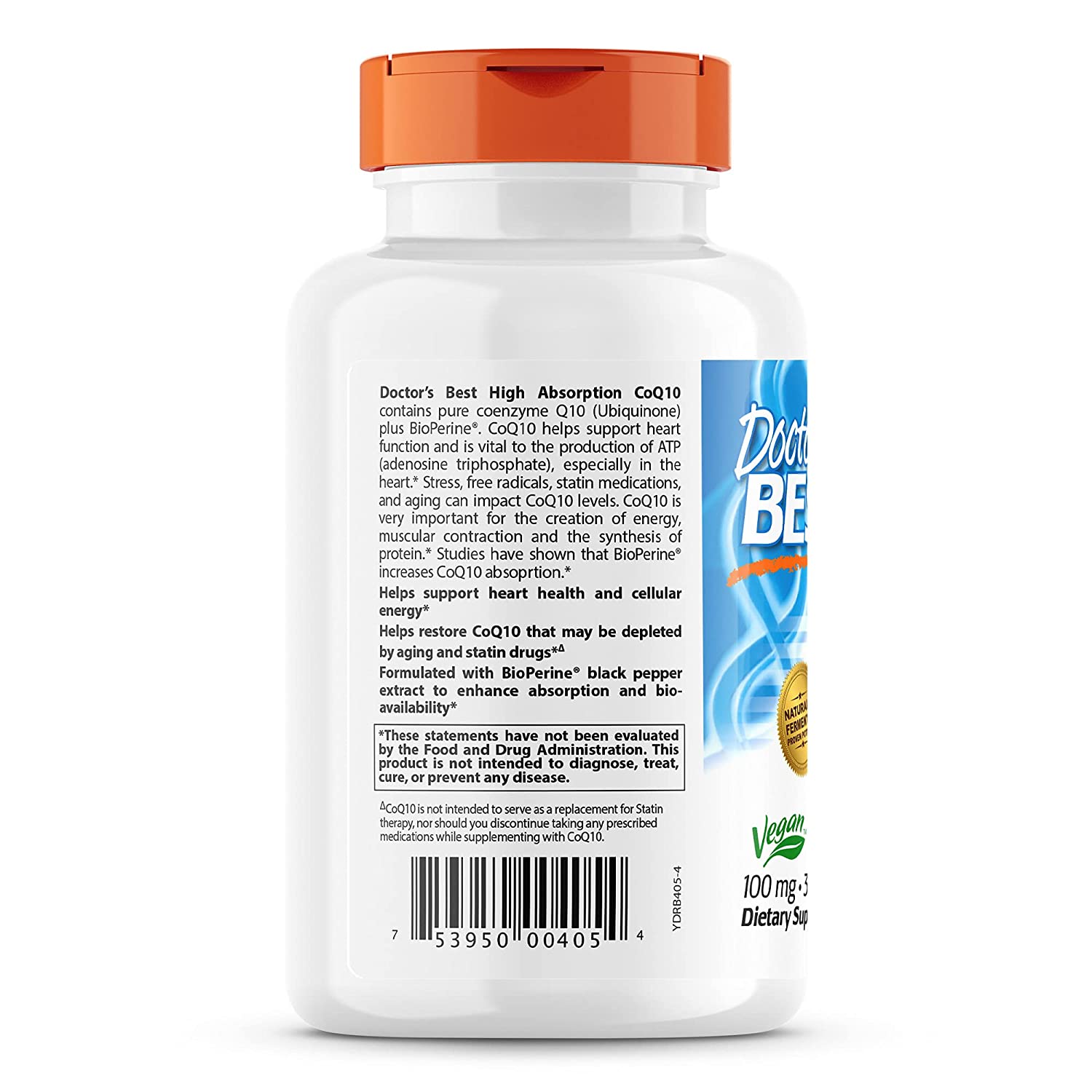Doctor's Best High Absorption CoQ10 contains pure coenzyme Q10 (Ubiquinone) plus BioPerine®. CoQ10 helps support heart function and is vital to the production of ATP (adenosine triphosphate), especially in the heart. Stress, free radicals, statin medications, and aging can impact CoQ10 levels. CoQ10 is very important for the creation of energy, muscular contraction and the synthesis of protein. Studies have shown that BioPerine® increases CoQ10 absorption.