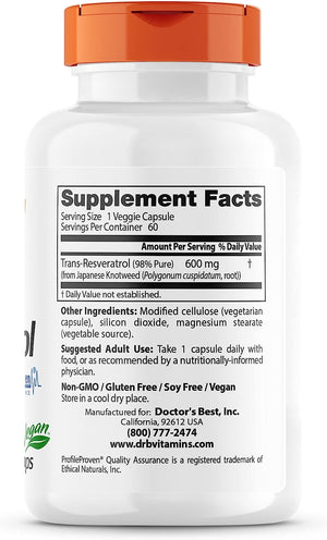 Doctor's Best High Potency Trans-Resveratrol 600 provides highly concentrated levels of trans-resveratrol (98% pure) from the root of the Japanese knotweed (Polygonum cuspidatum). Trans-Resveratrol is a unique antioxidant with the ability to cross the blood-brain barrier.