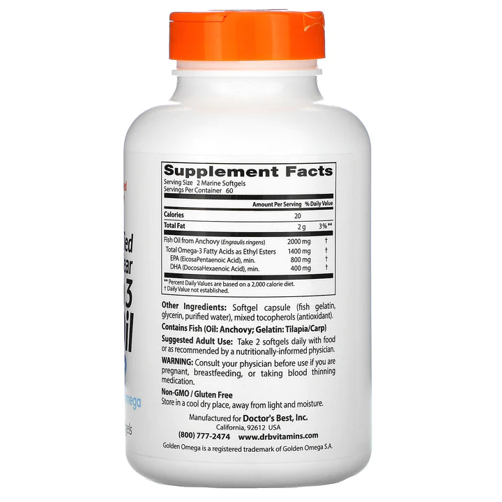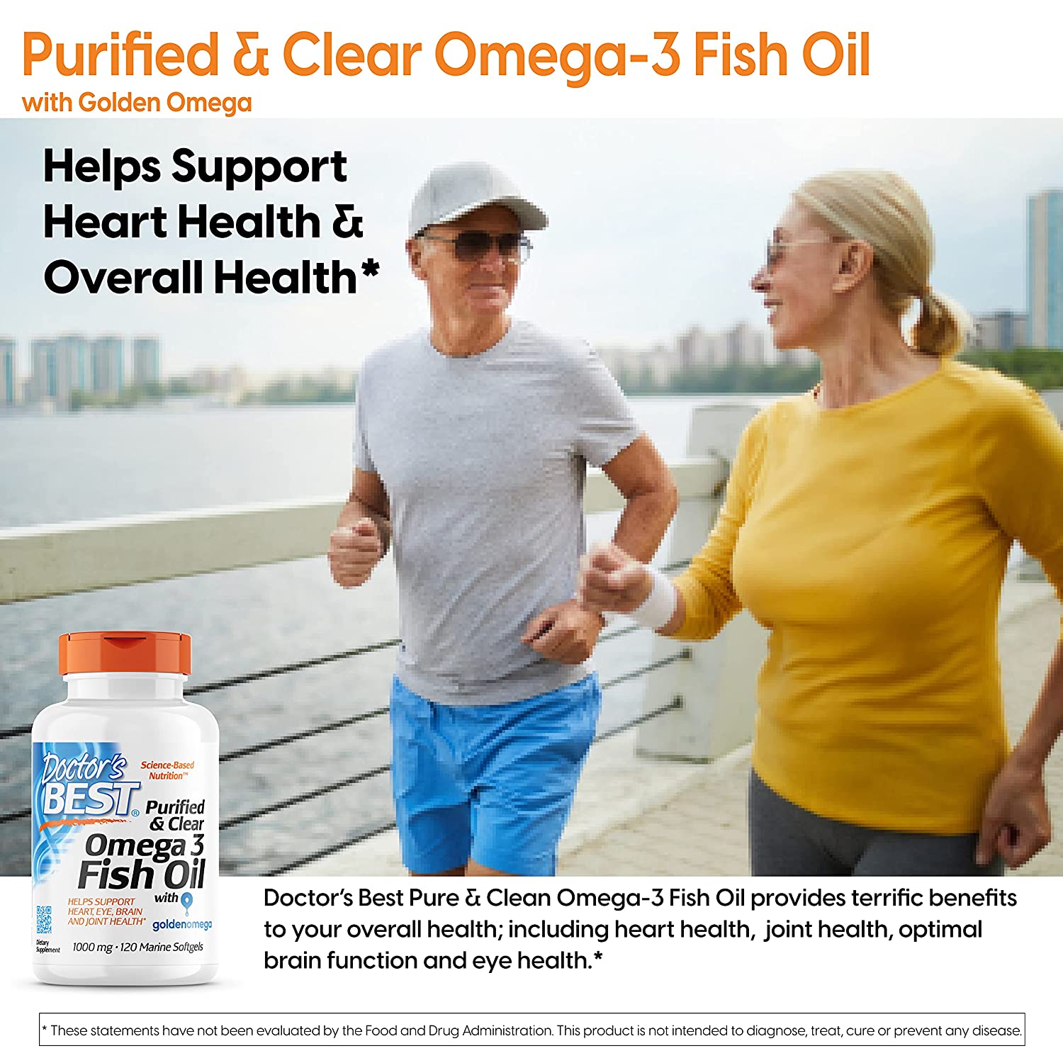 Doctor's Best Purified & Clear Omega 3 Fish Oil with Goldenomega 1,000 mg per serving | 120 Marine Softgels
