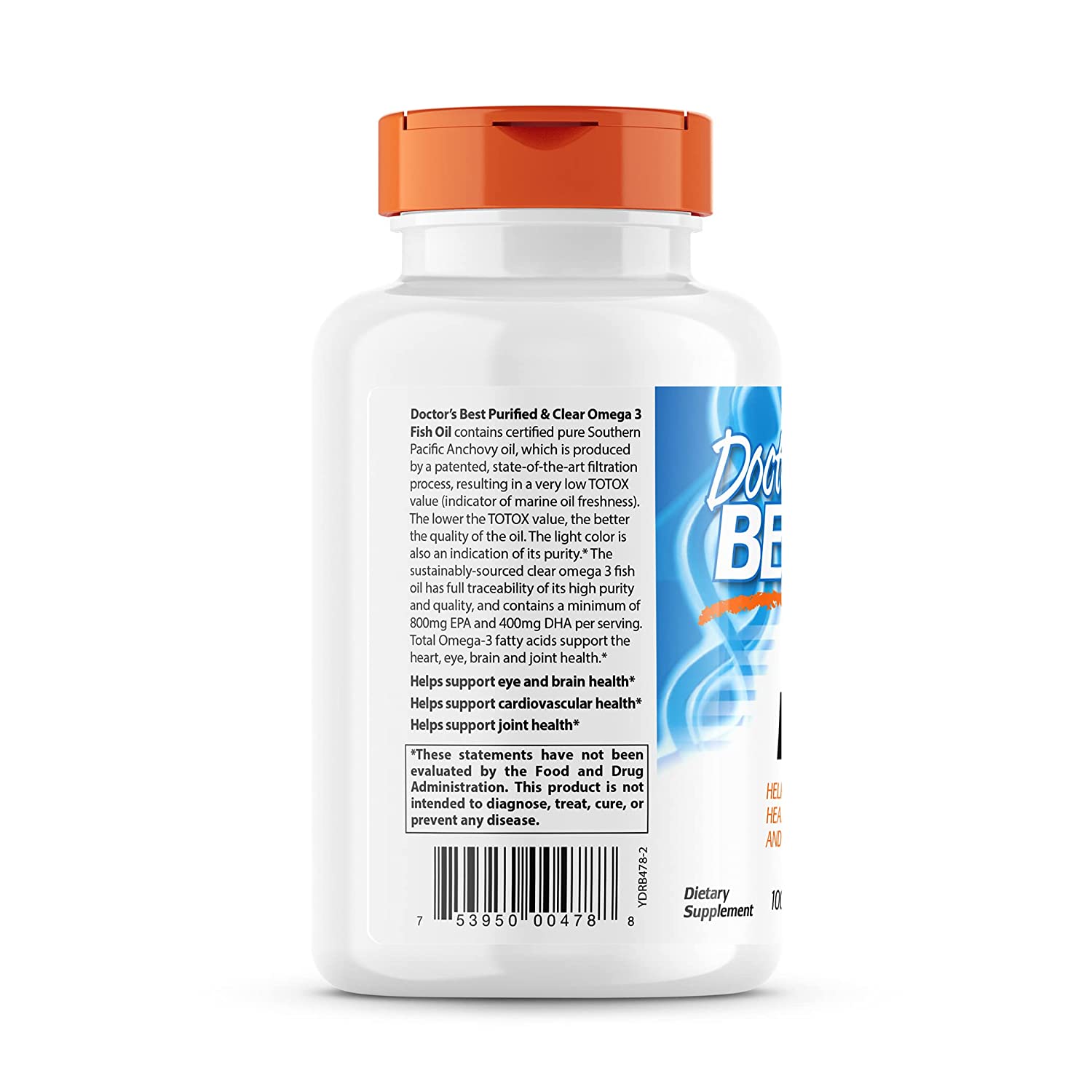 Doctor's Best Purified & Clear Omega 3 Fish Oil contains certified pure Southern Pacific Anchovy oil, which is produced by the patented, state-of-the-art filtration process, resulting in a very low Totox value (indicator of marine oil freshness). The lower the Totox value, the better the quality of the oil. The light color is also an indication of its purity. The sustainability-sourced clear omega 3 fish oil has full traceability of its high purity and quality, and contains a minimum of 800 mg EPA and 400 mg DHA per serving. Total Omega-3 fatty acids support the heart, eye, brain and joint health.
