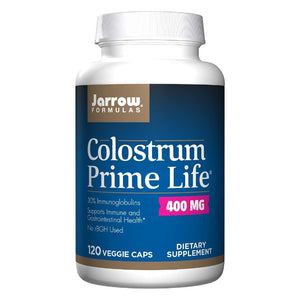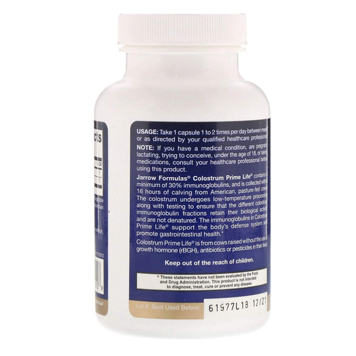 Jarrow Formulas® Colostrum Prime Life® formula contains a minimum of 30% immunoglobulins, proteins that support immune and gastrointestinal health. Colostrum is collected within 16 hours of calving from American pasture-fed cows that have been raised without the use of growth hormone (rBGH), antibiotics or pesticides in their feed. Colostrum low-temperature processing, along with analytical testing, ensures that immunoglobulin fractions are not denatured. To further minimize the denaturation of immunoglobulins, Colostrum Prime Life® is delivered in delayed release capsules.