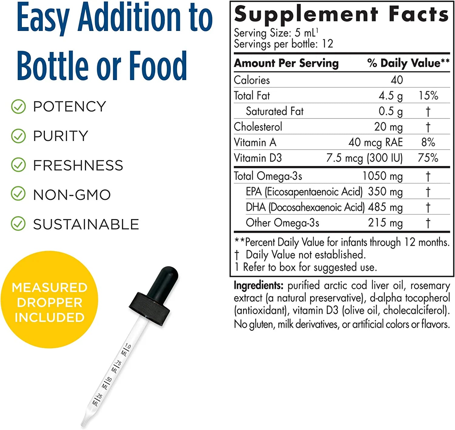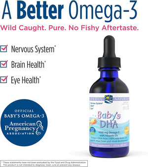 AWARD-WINNING BABY'S DHA OMEGA-3s - Nordic Naturals Baby’s Vitamin DHA Supplement is the Official Baby’s Omega-3 of the American Pregnancy Association. Vit D drops for infants 5-35 lbs.