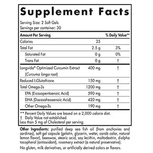 Give yourself cellular level protection with Nordic Naturals Omega Curcumin Supplement. Each serving of Omega 3 fish oil and Curcumin delivers 1,000 mg of total omega-3s as well as 400 mg of Longvida(R) optimized curcumin extract and 150 mg Reduced L-Glutathione Supplement. Unique blend of fish oil omega 3 plus curcumin (from turmeric) and potent antioxidants. Nordic Naturals is Committed to Delivering the World's Safest, Most Effective Nutrients Essential to Health. Nordic Naturals is the #1 selling fish oil in the US with over 150 products in a variety of flavors and doses to meet everyone's nutritional needs. We strive to provide high-quality products straight from the manufacturer to your home through sustainable methods and using nothing but natural ingredients. All Nordic Naturals fish oil products are offered in the triglyceride molecular form—the form naturally found in fish, and the form your body most easily absorbs.* Everything we make is non-GMO and third-party tested, surpassing the strictest international standards for purity and freshness. Certificates of Analysis are available for any product. Nordic Naturals fish oils are Friend of the Sea (FOS) certified and sustainably made in a zero waste facility powered by biofuel.