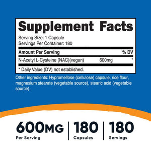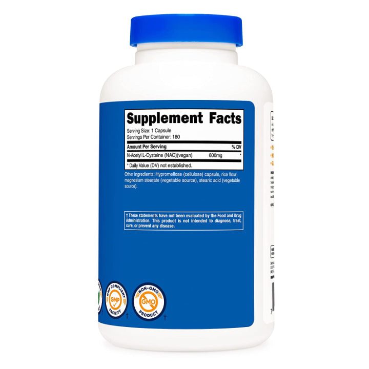- Nutricost N-Acetyl L-Cysteine contains 600 MG of potent, high-quality NAC per serving. This NAC is vegetarian-friendly, Non-GMO, Gluten-Free, Soy Free and in plant-based capsules.